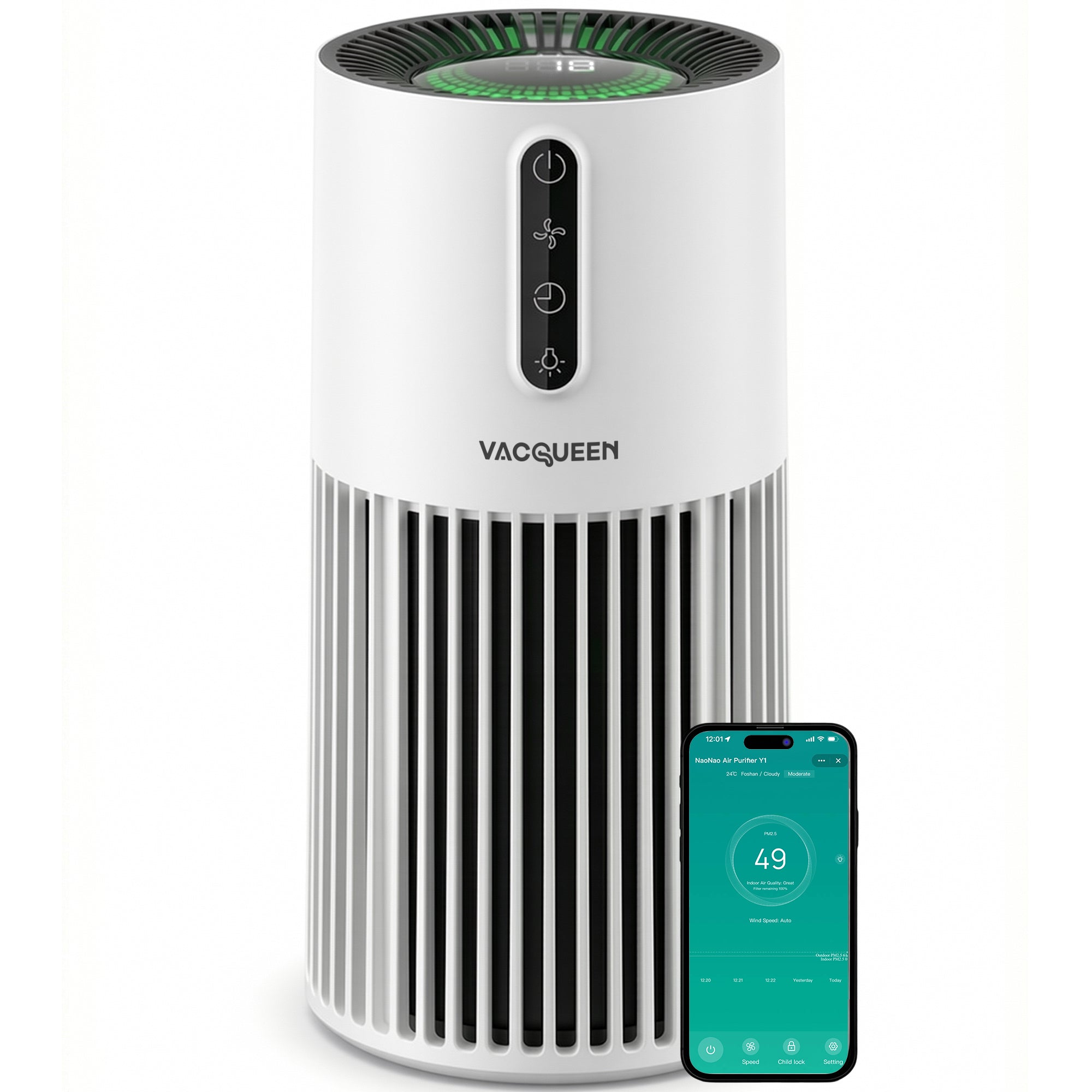 Vacqueen Smart Air Purifier for Pets & Bedrooms, 1800 ft², WiFi & Alexa, Air Quality Monitor