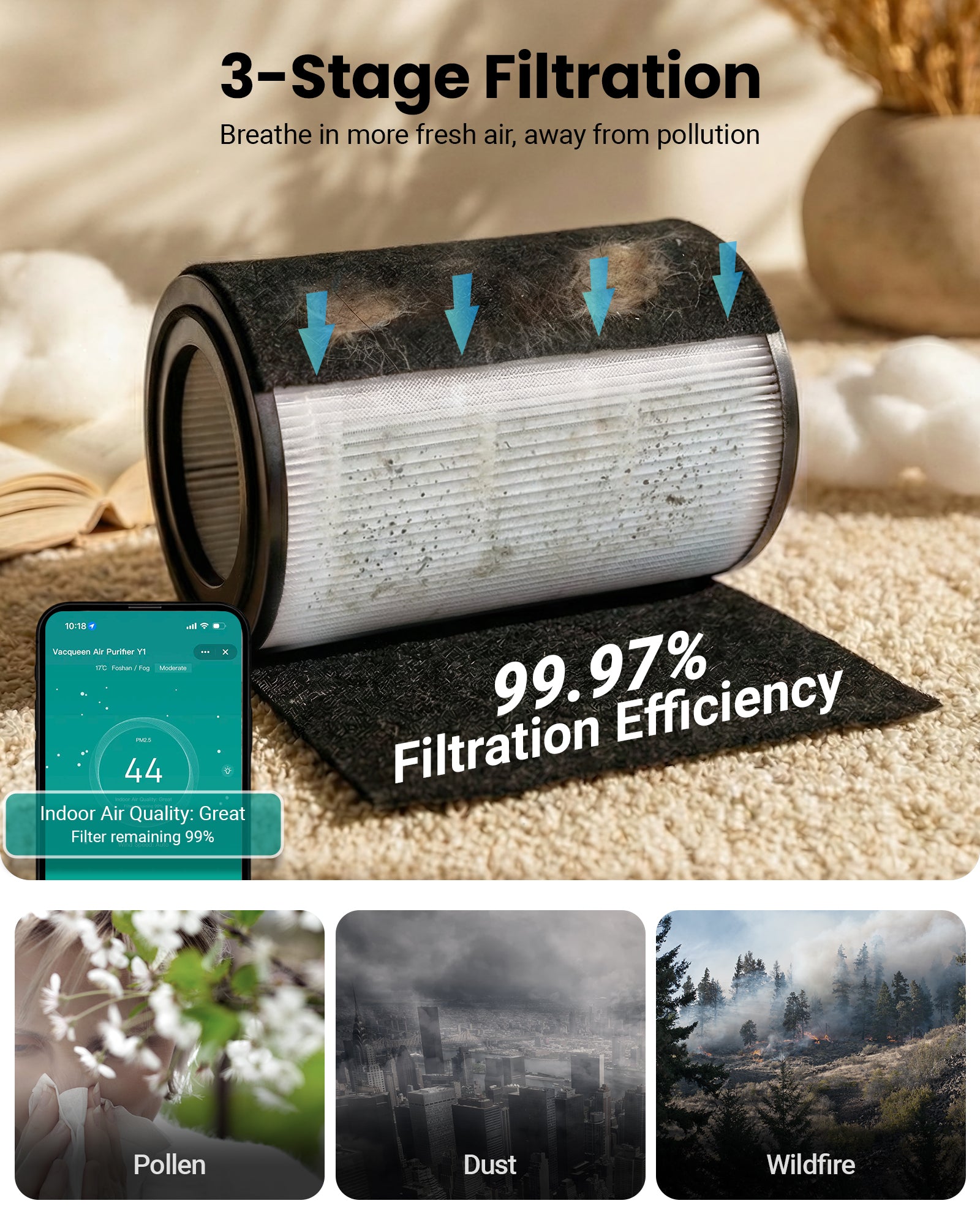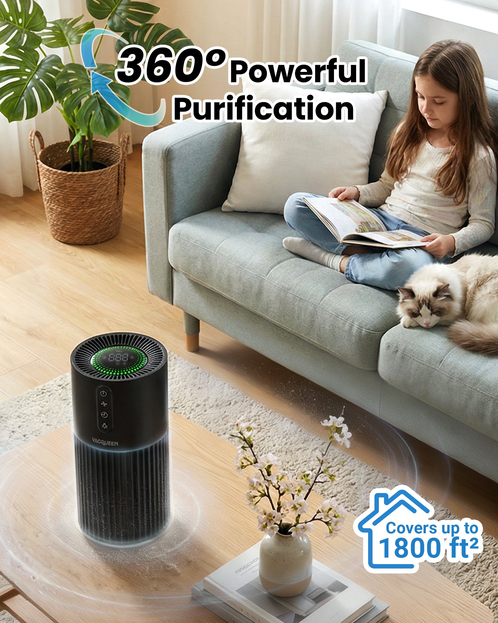 Vacqueen smart air purifier for homes with pets, allergies, or smoke, covering up to 1800 ft² with a 3‑stage filter that captures 99.97% of dust, pollen, pet dander, and odors, helping reduce allergy symptoms like sneezing and congestion. It offers WiFi and Alexa control, PM2.5 air quality monitoring, Sleep Mode (25 dB), a timer, and Auto Mode for hassle‑free clean air.